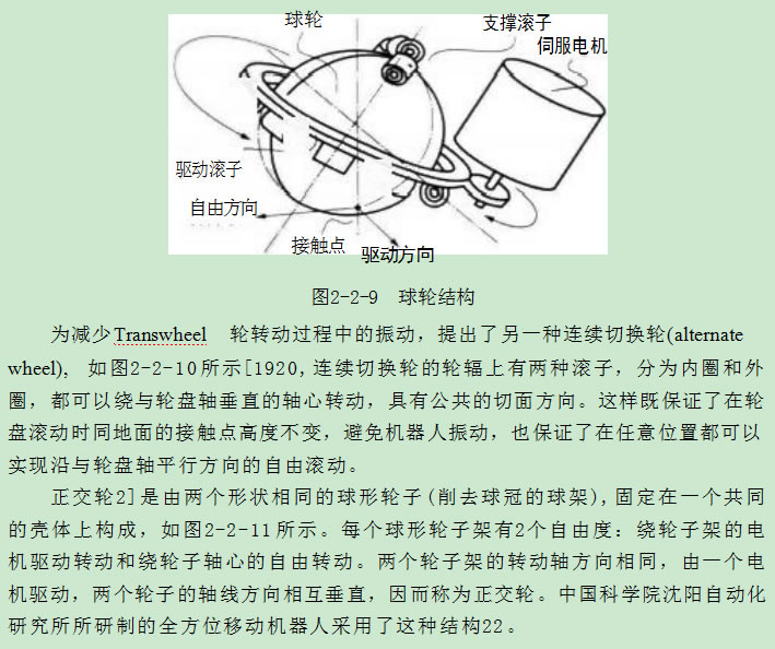 球 輪(ball wheel)由一個(gè)滾動(dòng)球體、 一組支撐滾子和一組驅動(dòng)滾子組成,其中 支撐滾子固定在車(chē)底盤(pán)上,驅動(dòng)滾子固定在一個(gè)可以繞球體中心轉動(dòng)的支架上,如 圖2-2-9所示15.16]。每個(gè)球輪上的驅動(dòng)滾子由一個(gè)電機驅動(dòng),使球輪繞驅動(dòng)滾子 所構成平面的法線(xiàn)轉動(dòng),同時(shí)可以繞垂直的軸線(xiàn)自由轉動(dòng)。輪子的驅動(dòng)力是滾子 和輪子的摩擦力,使得輪子的驅動(dòng)力和速度受到限制,這也是球輪的缺點(diǎn)。同時(shí), 輪子在地面滾動(dòng)過(guò)程中吸附的一些灰塵,會(huì )在輪子和滾子的接觸點(diǎn)積累,影響兩者 之間的摩擦力,使輪子打滑,我們在使用滾動(dòng)鼠標時(shí)都會(huì )有同樣的感受。因而,對 球輪的改進(jìn)方法是有效增加滾子和球體之間的摩擦驅動(dòng)力。