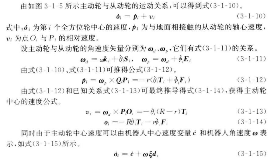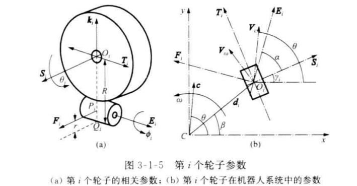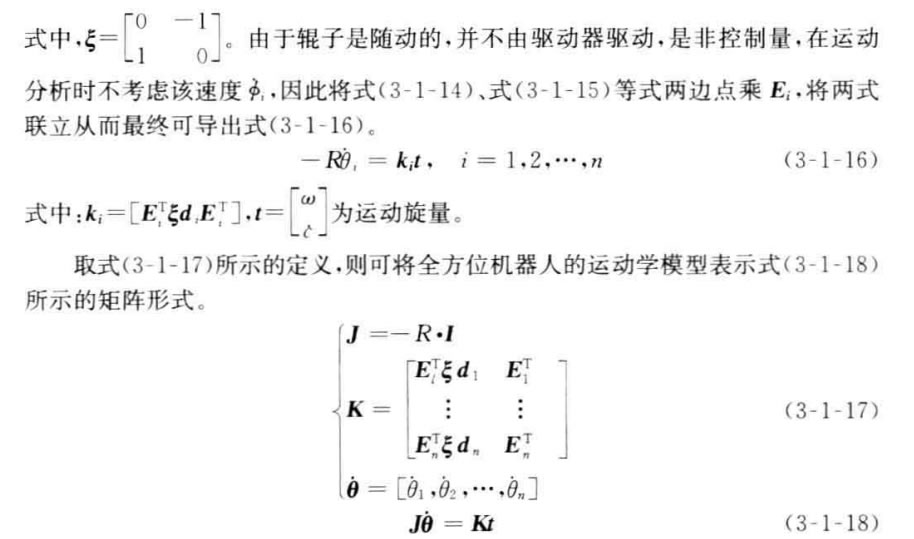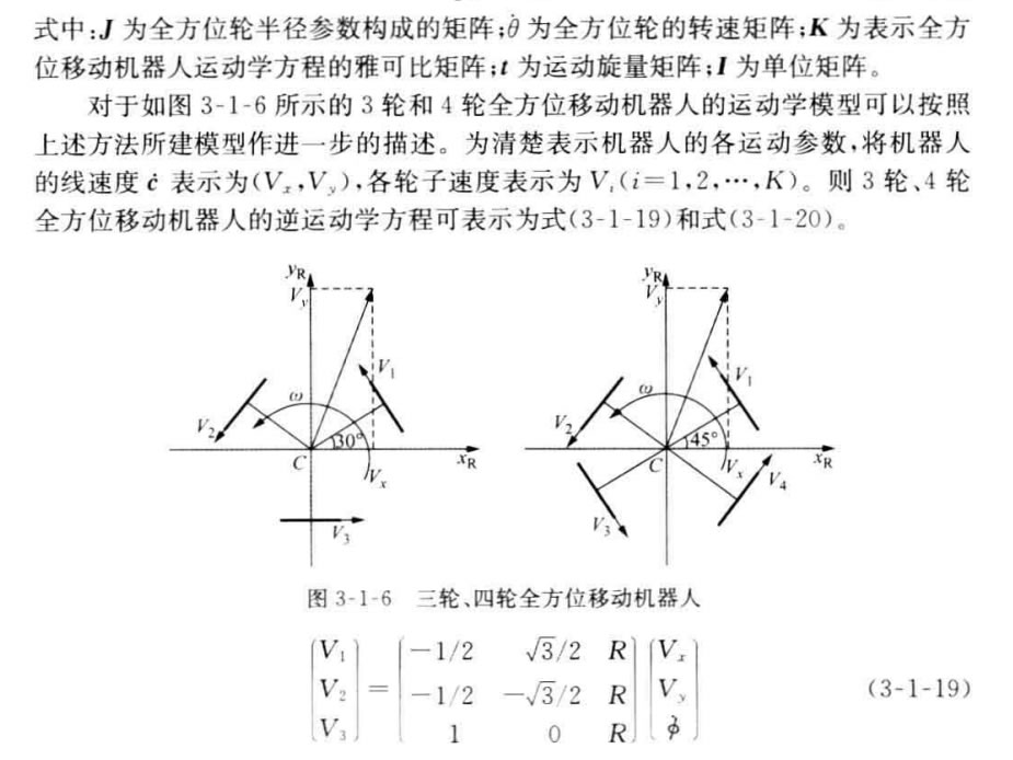 具有傳統車(chē)輪的機器人只能有兩個(gè)自由度的運動(dòng),所以在運動(dòng)學(xué)上,它等價(jià)于 傳統的陸上車(chē)輛。然而,具有全方位輪的機器人有3個(gè)自由度運動(dòng)的能力,即沿著(zhù) 平面上x(chóng) 軸、y 軸以及繞自身中心旋轉的運動(dòng)能力,這充分增加了機器人的機動(dòng) 性。本節將給出這種全方位移動(dòng)機器人的運動(dòng)學(xué)模型。