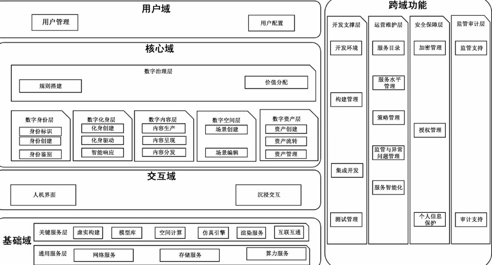 元宇宙系統架構可劃分為四個(gè)功能域和跨域功能(見(jiàn)圖1),包括: