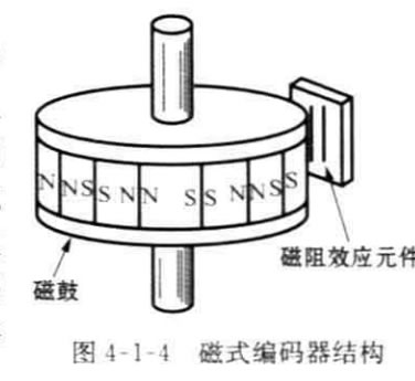 磁式編碼器是通過(guò)在強磁性材料表面上等 間隔的磁化刻度標尺,標尺旁邊相對放置磁阻 效應元件或霍爾元件,即能檢測磁通的變化,如 圖4-1-4所示,兩個(gè)磁傳感器的距離恰好是磁化 標尺間隔的1/4. 因此可以根據輸出信號的相位 關(guān)系檢測旋轉方向。與光學(xué)編碼器相比,磁式編 碼器的刻度間隔大,但它具有耐油污、抗沖擊等 特點(diǎn)。