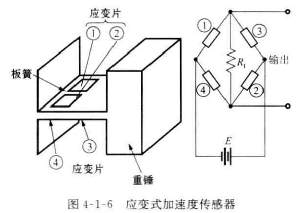應變片加速度傳感器3:應變片加速度傳感器是由一個(gè)板簧支承重錘所構成 的振動(dòng)系統。在板簧兩面分別貼兩個(gè)應變片,應變片受振動(dòng)產(chǎn)生應變,其電阻值的 變化通過(guò)電橋電路的輸出電壓被檢測出來(lái)。