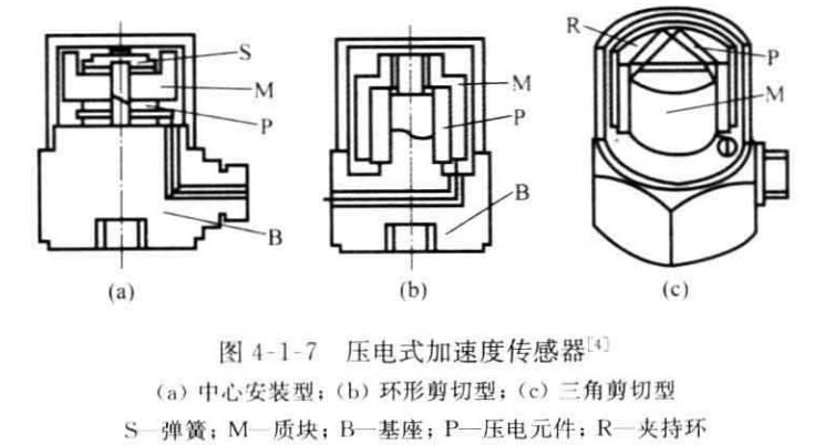 常用的壓電式加速度計的結構形式如圖4-1-7所示。圖中(a) 是安裝壓 縮型,壓電元件 一質(zhì)量塊 一 彈簧系統裝在圓形中心支柱上,支柱與基座連接。這種 結構有高的共振頻率。然而基座B 與測試對象連接時(shí),如果基座 B 有變形則將直 接影響拾振器輸出。此外,測試對象和環(huán)境溫度變化將影響壓電元件,并使預緊力 發(fā)生變化,易引起溫度漂移。圖(c) 為三角剪切形,壓電元件由夾持環(huán)將其夾牢在 三角形中心柱上。加速度計感受軸向振動(dòng)時(shí),壓電元件承受切應力。這種結構對 底座變形和溫度變化有極好的隔離作用,有較高的共振頻率和良好的線(xiàn)性。圖(b) 為環(huán)形剪切型,結構簡(jiǎn)單,能做成極小型、高共振頻率的加速度計,環(huán)形質(zhì)量塊粘到 裝在中心支柱上的環(huán)形壓電元件上。由于粘結劑會(huì )隨溫度增高而變軟,因此Z高 工作溫度受到限制。