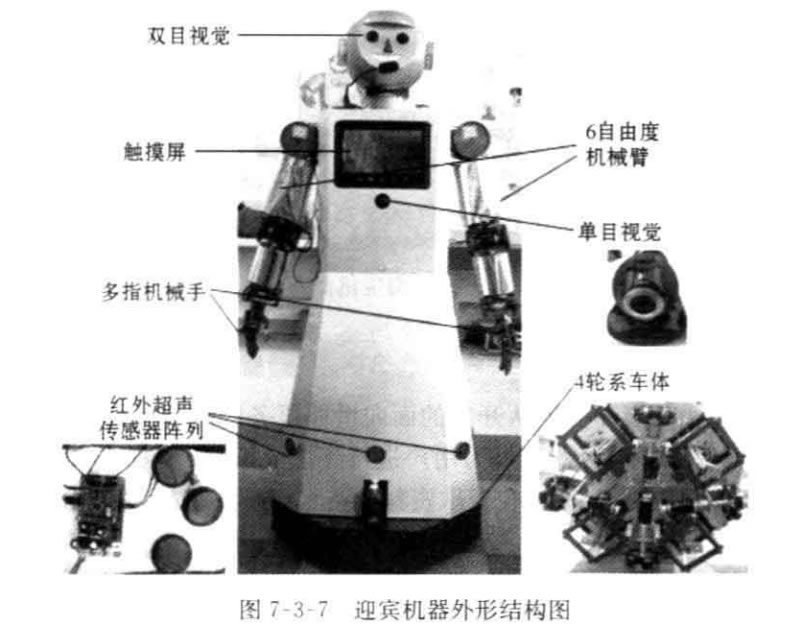 迎賓機器人采用造型活潑的卡通形象,其外形如圖7-3-7所示,頭部有雙目視覺(jué)傳感器,身體部分主要包括觸摸屏、機械臂和機械手。身高約1.4~1.5m, 采 用 輪式移動(dòng)方式,Z高移動(dòng)速度約18m/min 。 可自主完成接待、導引、語(yǔ)音提示、點(diǎn) 菜等服務(wù)工作。連續工作時(shí)間不小于2小時(shí)。主要參數如下: