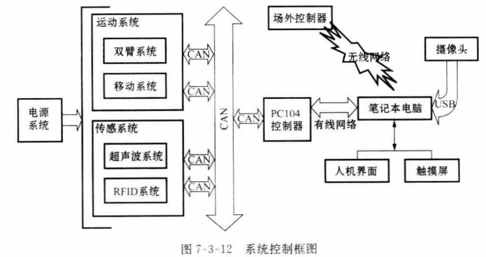 迎賓服務(wù)機器人系統各硬件模塊主要由CAN 總線(xiàn)連接,通過(guò)統一的CAN 總 線(xiàn)協(xié)議將各模塊簡(jiǎn)單地加載到系統中。系統主要由電源系統、運動(dòng)控制系統、傳感 系統等組成,其中運動(dòng)控制系統包括雙臂系統及移動(dòng)系統,傳感器系統包括超聲波系統、RFID定位系統、視覺(jué)系統組成。
