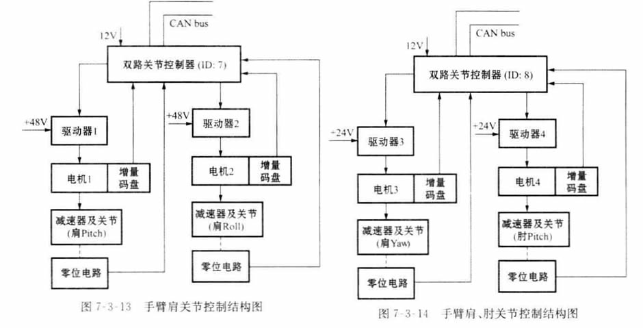 手臂各關(guān)節控制電路采用分布式控制系統,各關(guān)節控制器(主 MCU 是 TMS320LF2407)由CAN 總線(xiàn)相連(CAN2.0-A 版本)?刂浦芷跒5m (即上位機 與 所 有 關(guān) 節 控 制 器 通 信 一 遍 , 再 加 一 定 裕 度 后 的 時(shí) 間 ) 。 各 關(guān) 節 控 制 電 路 結 構 如 圖7 - 3 - 13、圖7 - 3 - 14及圖7 - 3 - 15所示。