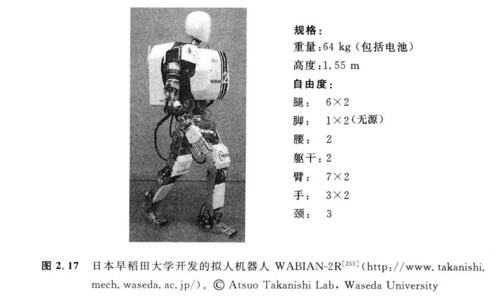 雙腳機器人一個(gè)重要的特征是它們具有類(lèi)似人的外形。它們可以被制造成和人 相近似的尺寸,這使得它們在人機交互的研究中成為出色的運載工具。日本早稻田 大學(xué)制造的WABIAN-2R (圖2.17)正是作這種研究的[255]。WABIAN-2R 被設計 成能夠模仿人的運動(dòng) , 并甚至設計成能夠像人一樣跳舞 。