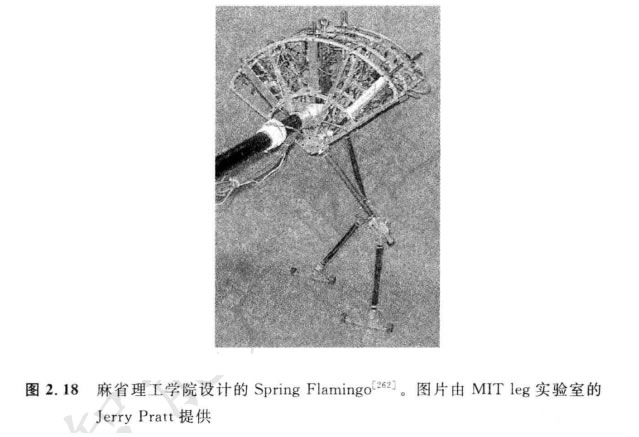 雙腳機器人只能在某些限制內靜態(tài)地穩定。因此,像P2 和WABIAN-2R 這樣的 機器人即使站著(zhù)不動(dòng),通常也需要連續地進(jìn)行伺服平衡校正。而且,各條腿都需要有足 夠的容量以支撐機器人全部重量。在四腿機器人情況下,平衡問(wèn)題隨各條腿上的負荷 需求而變得容易解決。雙腿機器人的 一個(gè) 出色設計是麻省理工學(xué)院設計的Spring Fla- mingo (圖2. 18)。這個(gè)機器人與腿激勵器相連,插入了彈簧,實(shí)現更有彈性的步態(tài)。通過(guò)與限制膝蓋關(guān)節角度的“膝蓋骨”相結合,Flamingo 實(shí)現了驚人的仿生運動(dòng)。
