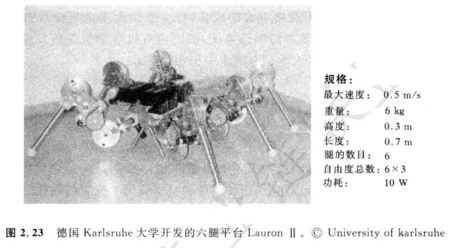 由于行走期間的靜態(tài)穩定性,六腿結構在移動(dòng)機器人學(xué)中已經(jīng)很流行(圖2.23 和圖1.3),因而降低了控制的復雜性。在大多數情況下,各條腿有3個(gè)自由度,包括