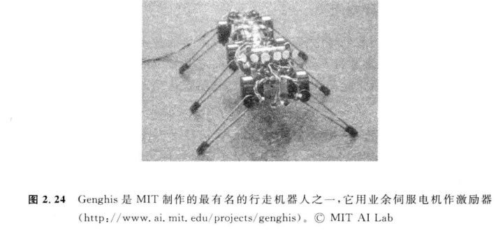 臀部彎曲、膝蓋彎曲和臀部外展(圖2.7)。Genghis 是一個(gè)商業(yè)上已可用的有6條腿 的業(yè)余機器人,各腿有業(yè)余伺服電機所提供的2個(gè)自由度(圖2.24)。這樣的機器人 僅由臀部彎曲和臀部外展組成,在粗糙的地形中機動(dòng)性較差,但在平地上則表現很 好。因為它是由直腿和伺服電機簡(jiǎn)捷裝配而成,所以機器人業(yè)余愛(ài)好者可以很容易 地制作這種機器人。