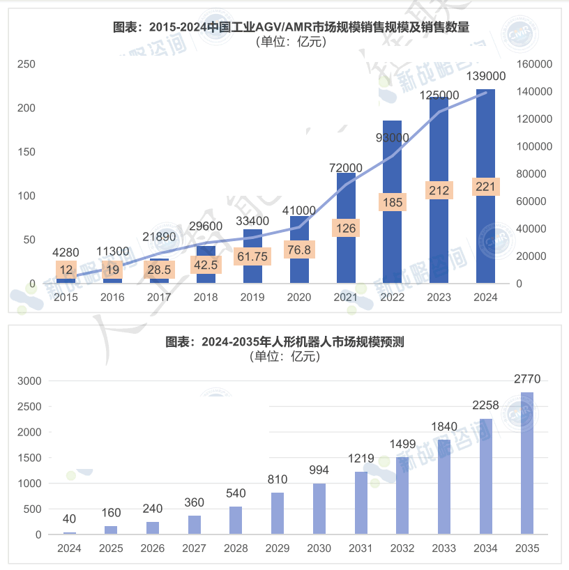根據新戰略移動(dòng)機器人產(chǎn)業(yè)研究所統計, 2024年ZG工業(yè)應用移動(dòng)機器人銷(xiāo)售規模為221億, 同比增長(cháng)4.25%; 銷(xiāo)售數量為139000臺, 同比增長(cháng)1 1.2% ZG市場(chǎng)人形機器人出貨量超2800臺, 市場(chǎng)規模超20億; 清潔及環(huán)衛機器人累計出貨超12900臺 (不含小型家用墻面清潔泳池清潔機器人) , 市場(chǎng)銷(xiāo)售規模約 27.6億元。 2024年, ZG智能移動(dòng)機器人整體市場(chǎng)已突破300億元。