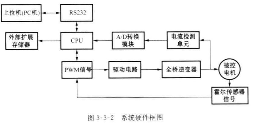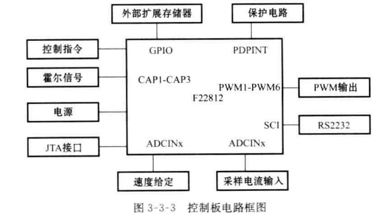 系統的硬件框圖如圖3-3-2所示,可以看出基本上包括一個(gè)以TMS320F2812DSP 為核心的DSP 控制板,一塊配套的功率驅動(dòng)板和一臺無(wú)刷直流電機。實(shí)現的 主要功能是控制指令的接收和執行,速度信號的接收和計算處理,電流采樣信號接 收和轉換,速度閉環(huán)和電流閉環(huán)控制算法的執行等。