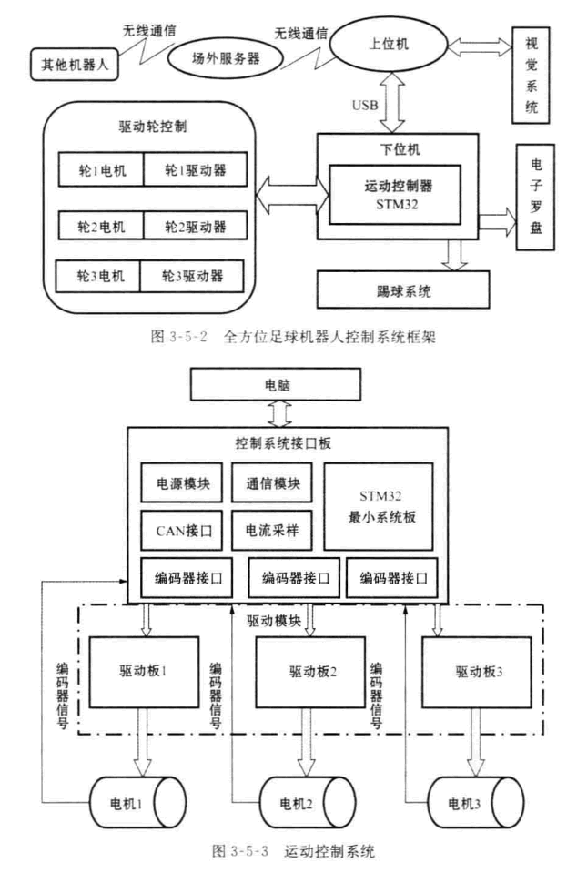 運動(dòng)控制系統由通信模塊、電源模塊、控制模塊和電機驅動(dòng)模塊組成。一塊主 控制板(STM32) 控制3塊驅動(dòng)電路,分別驅動(dòng)3個(gè)全方位輪,實(shí)現3軸聯(lián)動(dòng)。當機器人工作時(shí),通信模塊負責從PC 機接收指令數據,包括3個(gè)輪子的速度和是否踢 球判斷以及踢球力度?刂颇K將3個(gè)輪子的速度發(fā)送到運動(dòng)控制模塊,并產(chǎn)生 一個(gè)踢球信號控制氣動(dòng)踢球系統產(chǎn)生踢球動(dòng)作。運動(dòng)控制模塊則控制著(zhù)3個(gè)輪子 的速度,并且將通過(guò)閉環(huán)采集到的電機碼盤(pán)信息獲得的3個(gè)輪子的速度反饋回PC 機,供機器人上層策略算法使用。其結構圖如圖3-5-3。通信模塊和運動(dòng)控制模塊的CPU采用的是 STM32F103CB。