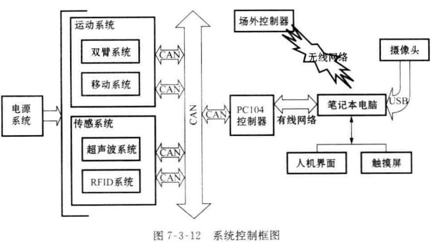 展廳機器人系統各硬件模塊主要由CAN 總線(xiàn)連接,通過(guò)統一的CAN總線(xiàn)協(xié)議將各模塊簡(jiǎn)單地加載到系統中。系統主要由電源系統、運動(dòng)控制系統、傳感系統等組成,其中運動(dòng)控制系統包括雙臂系統及移動(dòng)系統,傳感器系統包括超聲波系統、RFID定位系統、視覺(jué)系統組成。具體結構由圖7-3-12所示。