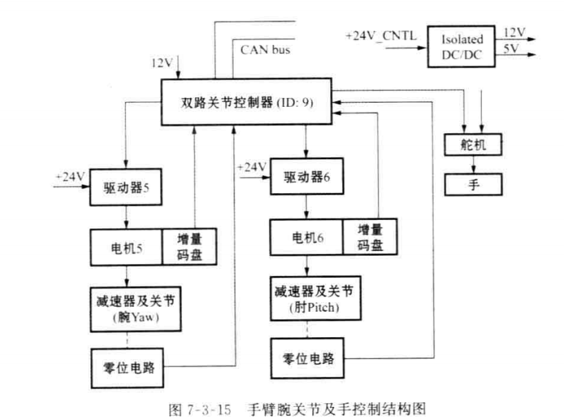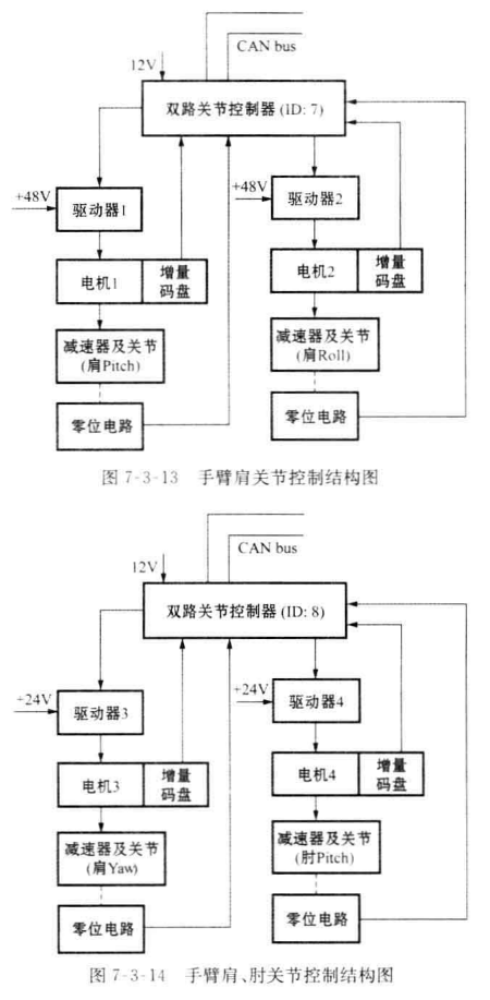 手臂各關(guān)節控制電路采用分布式控制系統,各關(guān)節控制器(主 MCU 是 TMS320LF2407)由CAN 總線(xiàn)相連(CAN2.0-A 版本)?刂浦芷跒5m (即上位機 與 所 有 關(guān) 節 控 制 器 通 信 一 遍 , 再 加 一 定 裕 度 后 的 時(shí) 間 ) 。 各 關(guān) 節 控 制 電 路 結 構 如