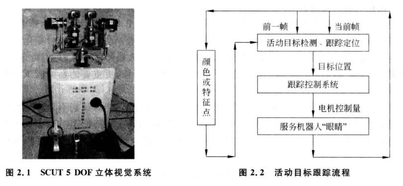 圖2.1所示的服務(wù)機器人“眼睛”是一個(gè)5 DOF 立體視覺(jué)系統,它能夠跟蹤和識別活 動(dòng)的目標。它是由 SCUT “智能計算機”科研團隊研制成功的。該“眼睛”包括兩個(gè)彩色 攝像機、圖像處理板、個(gè)人電腦、數據采集卡、5個(gè)直流電機、直流電機驅動(dòng)器?紤]到主 動(dòng)跟蹤和目標特征與速度和魯棒性等要求,該“眼睛”以基于顏色的跟蹤算法為基礎,結 合目標特征跟蹤及目標運動(dòng)預測等就可以對活動(dòng)目標進(jìn)行跟蹤和識別。
