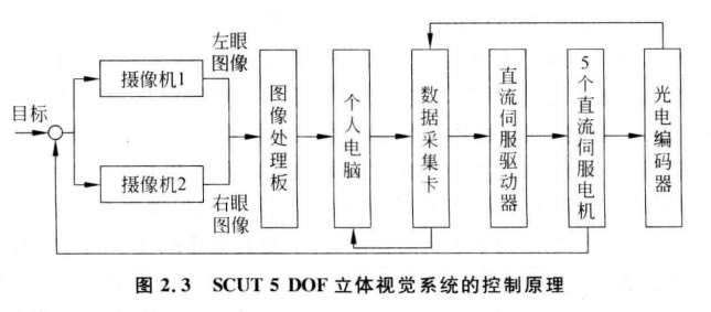 SCUT 5 DOF 立體視覺(jué)系統的控制原理如圖2.3所示,兩個(gè)彩色攝像機拍攝待識別 目標圖像,經(jīng)過(guò)圖像處理板后送入個(gè)人電腦進(jìn)行分析,經(jīng)過(guò)顏色或特征跟蹤算法處理后, 形成5個(gè)直流電機的轉角控制指令,并經(jīng)由數據采集卡和直流電機驅動(dòng)器放大后驅動(dòng)5個(gè)直流電機轉動(dòng),從而帶動(dòng)兩個(gè)攝像機分別或共同作上、下、左、右、旋轉運動(dòng),跟蹤待識 別目標。無(wú)論待識別的目標怎樣活動(dòng),只要不離開(kāi)兩個(gè)攝像機的視覺(jué)范圍,這個(gè)跟蹤和 識別過(guò)程就一直持續地進(jìn)行下去。由圖2 .3可以看到,5個(gè)直流電機的輸出(它們的轉 動(dòng),即兩個(gè)攝像機的運動(dòng))是直接連接到或者說(shuō)跟蹤目標的。