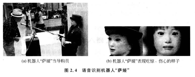 日本著(zhù)名的東京高島屋商場(chǎng)為了解決顧客排長(cháng)隊購物難的問(wèn)題,引入了一款語(yǔ)音識 別機器人“薩婭”當導購員,如圖2.4所示!八_婭”能夠用超過(guò)700種不同的語(yǔ)音方式對 購物者的問(wèn)題和投訴做出反應,它會(huì )告訴顧客去哪層樓能夠買(mǎi)到他們所需的商品,還能 和他們閑聊幾句,但是有時(shí)也會(huì )無(wú)法“溝通”。曾有一位記者問(wèn)“薩婭”問(wèn)題,可能是因為 他口音太重,“薩婭”聽(tīng)不懂,一直指著(zhù)洗手間的方向,無(wú)法告訴記者所要去的商場(chǎng)樓層。 雖然“薩婭”的面部動(dòng)作還存在一些不足,但是它表現高興、傷心或生氣時(shí)是很逼真的。 盡管“薩婭”是一個(gè)語(yǔ)音識別服務(wù)機器人,但是它像其他日本人那樣講禮貌,彬彬有禮。