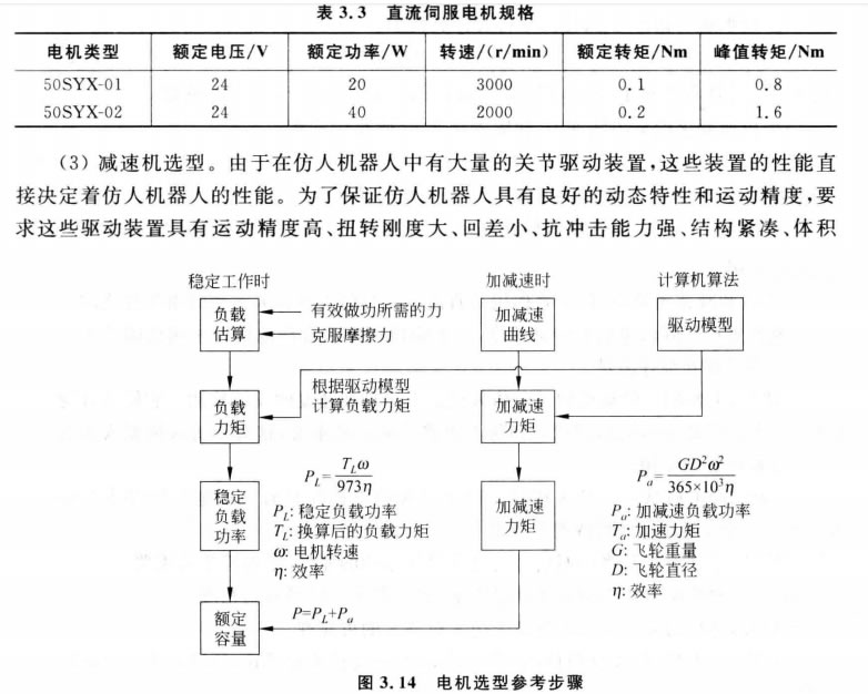 電機是將電能轉化為機械能的部件,由此發(fā)生的力經(jīng)過(guò)以減速器為核心的動(dòng)力傳遞 系統到達負載端。在此過(guò)程中, 一部分力克服摩擦,以熱能的形式耗散出去,因此傳動(dòng)效 率無(wú)法達到100%。在實(shí)際設計中,應該將上述路線(xiàn)的順序倒過(guò)來(lái),即以負載的大小和摩 擦系數及運動(dòng)效率去推算電機的容量。施加于電機的負載大致可以劃分成三種基本類(lèi) 型:有效力、無(wú)效力、慣性力。智能交互機器人的驅動(dòng)器大致有直流電機、步進(jìn)電機、舵機。如 圖3.14所示為電機選擇的方法和步驟。從圖中可知,決定電機容量時(shí),涉及負載估算、 驅動(dòng)對象運動(dòng)規律確定、傳動(dòng)系統轉動(dòng)慣量折算等內容[96]。