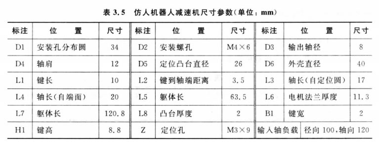 (2)直流伺服電機選型。根據上面的分析,為本節設計的智能交互機器人選用了兩種 類(lèi)型的直流伺服電機,分別是上海瑞克科技發(fā)展有限公司的50SYXB-01 和 5 0SYXB- 02,質(zhì)量大約為0.5~1.0kg, 規格如表3.3所示。從表中不難看出這種直流伺服電機 轉速非常高,Z高可達到3000r/min(轉/分鐘);而其轉矩又很小,不能直接用于關(guān)節驅 動(dòng)裝置。