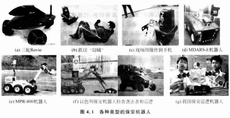 美國的一家公司正在研制一種多用途保安機器人MPR-800, 它可用于掃雷、滅火、核 生化污染清除等多項危險工作,如圖4.1(e) 所示。以色列的保安機器人也非常先進(jìn),除 了可以檢查恐怖襲擊者外,還可以保障飛機跑道的安全,如圖4.1(f)所示。俄羅斯研制 的D一個(gè)保安機器人已于2007年6月開(kāi)始正式在彼爾姆市街頭巡邏,該保安機器人質(zhì) 量為250kg, 身高180cm, 配備有5臺照相機和供路人使用的求助按鈕。并且它還會(huì )發(fā)出 一些簡(jiǎn)單的指令,例如勸誡人們不要在街上酗酒滋事等。此外,我國東莞理工學(xué)院的大 學(xué)生也設計了一個(gè)保安巡邏機器人,如圖4.1(g) 所示。它以太陽(yáng)能為主,電動(dòng)小車(chē)為載 體,采用多種高性能傳感器自動(dòng)地檢測障礙物和完成自動(dòng)值守、報警等各種保安任務(wù)。 它能在校園和小區及其他環(huán)境下完成巡邏監控,或者與固定監控設備組成一個(gè)嚴密的監 控網(wǎng)絡(luò )。