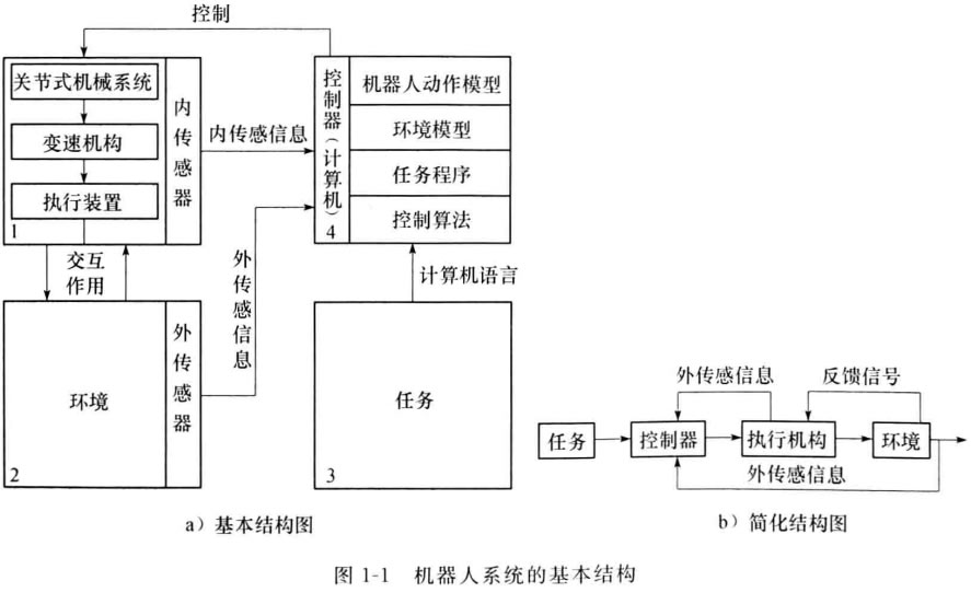 一 般情況下, 一 個(gè)機器人系統由下列四個(gè)互相作用的部分組成:機械手、環(huán)境、任務(wù) 和控制器,如圖1 - 1a 所示,圖1 - 16為其簡(jiǎn)化形式。